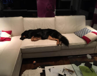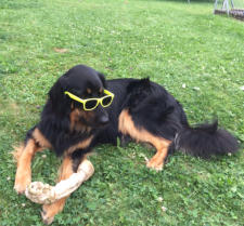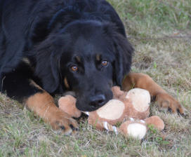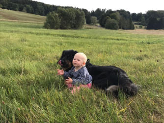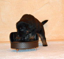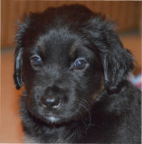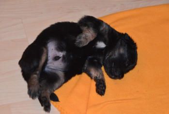 Buddy (Aramis) - der hübsche SängerBuddy hat sich dann auch recht flott auf den Weg gemacht und kam um 3:56 Uhr mit zur Welt, ein kräftiger Rüde mit423 g. Mareike und Peter, die Dosenöffner von Papa Bastian, haben im Vorfeld einen Namenswunsch geäußert und so wurde der erste schwarzmarkene Rüde entsprechend Aramis getauft. Die Ähnlichkeit zwischen Buddy, wie Aramis jetzt heißt, und seinem Papa ist unverkennbar. Auch vom Charakter kommen sich die beiden sehr nahe und erzählen gern jedem Zuhörer Geschichten aus ihrem Leben. ;) Buddy zog nach Lohra bei Marburg zu Steffi und Karsten. Er hat sich ebenfalls super entwickelt. Auch wenn er anfangs ein ganz schöner Rabauke war und so manches Hab und Gut in Steffis Wohnung dran glauben musste, sind alle sehr glücklich miteinander. Mittlerweile übt sich Buddy als „großer Bruder“ bzw. Beschützer seiner zweibeinigen großen Liebe. Ein Herz und eine SeeleIn der Welpenstube